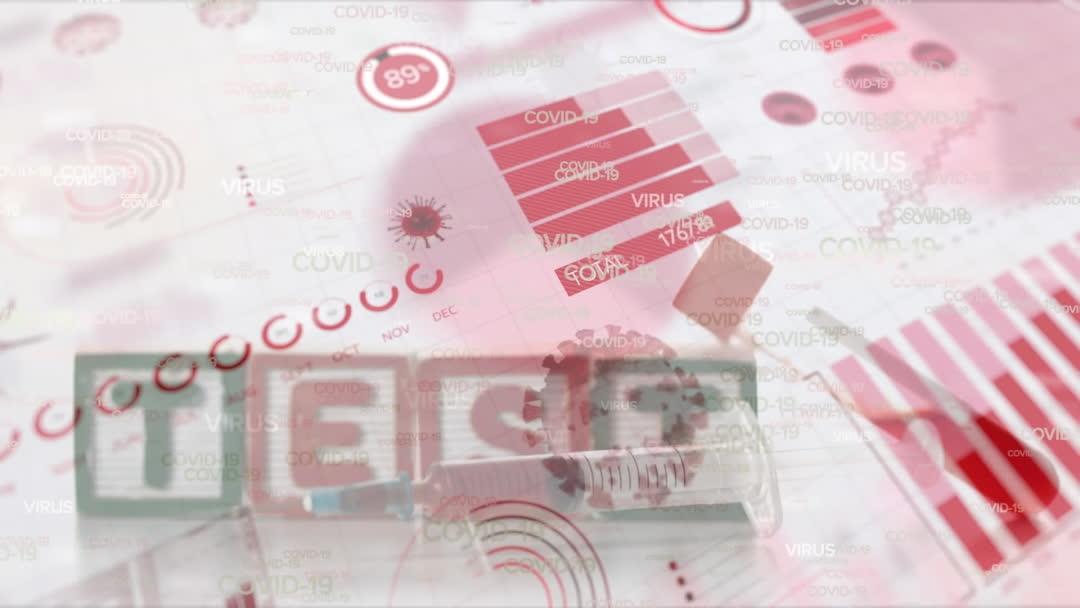 This digitally animated scene shows a dynamic interface blending medical infographic elements with focus on COVID-19. Features graphics of infected cells and financial data intertwined with elements such as a prominent syringe and cubes representing test results. Ideal for use in contexts related to healthcare analytics, COVID-19 reporting, presentations on virus impact, data transparency, and informational content about medical developments.