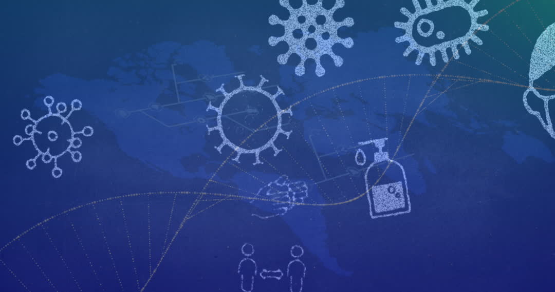 Illustration combines COVID-19 safety icons with microbiological themes over a digital interface background. Suitable for education, presentations on public health, or material about the global pandemic and virus protection strategies.