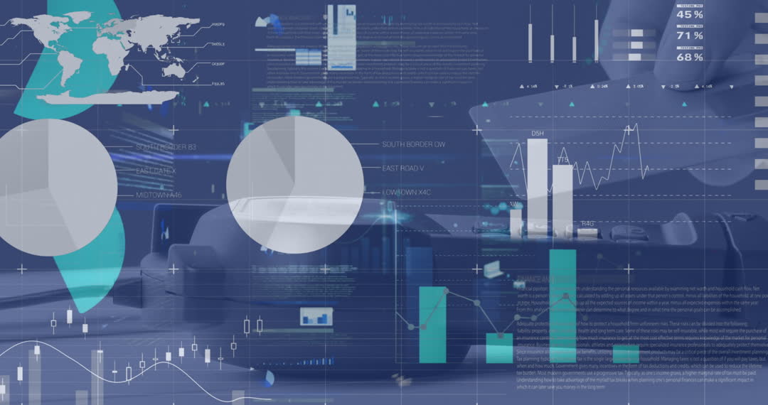 This visual representation showcases a dynamic digital interface incorporating data analytics, technology graphs, and charts set in an office environment. Useful for illustrating modern business operations, global financial strategies, and technological integration in presentations, marketing materials, or educational resources related to data-driven decision-making and business innovation.