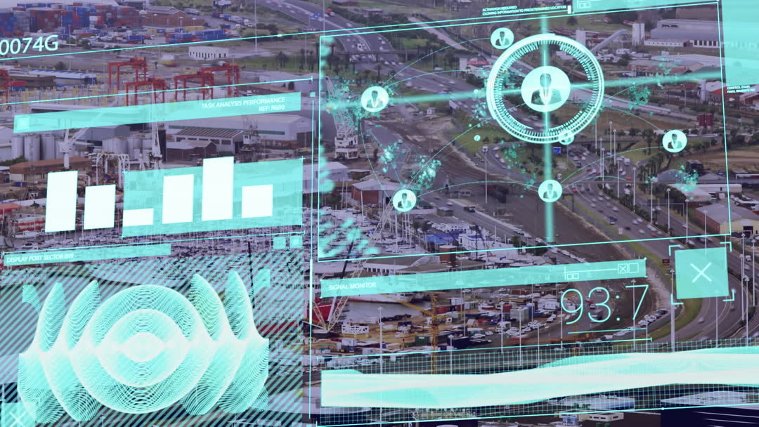 Animated graphics display statistics and data processing over a busy industrial landscape, showcasing technological integration. Ideal for illustrating concepts in smart technology, business intelligence, and analytics software.