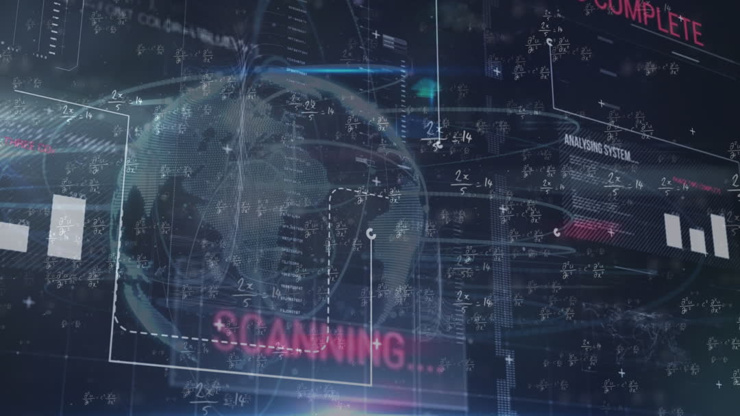 An animated scene of a digital interface displaying a rotating globe overlaid with numerical data and complex equations, symbolizing data processing and analytics. Suitable for use in technological presentations, videos focused on data science, or content related to futuristic innovations in interface design.