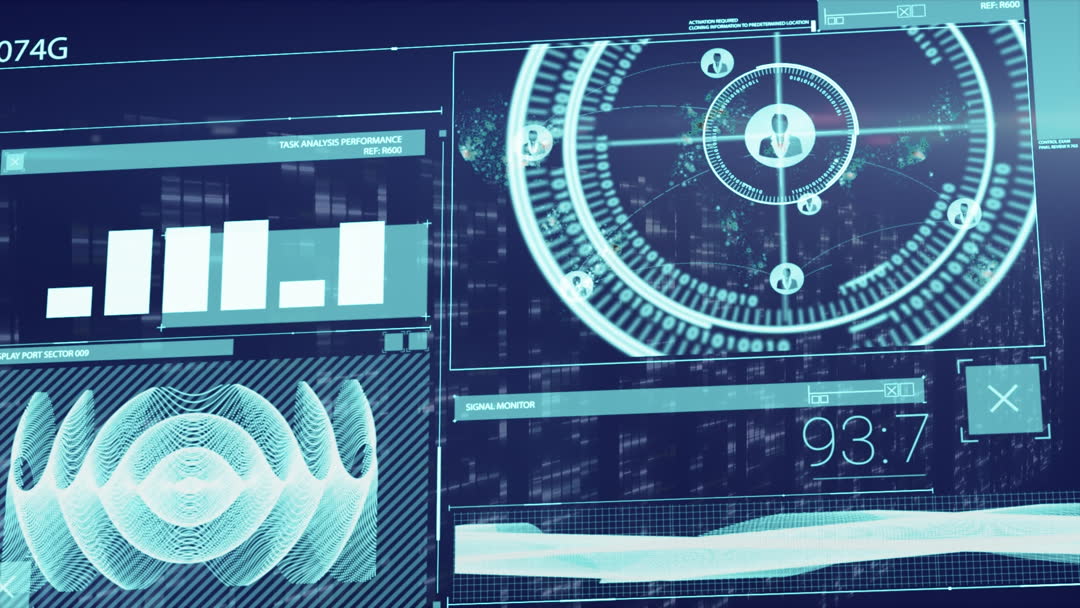 Displays a complex data interface with charts, graphs, and widgets, set against a futuristic blue background. Excellent for use in presentations, reports, or media related to technology concepts, scientific progress, data analysis techniques, or business intelligence.