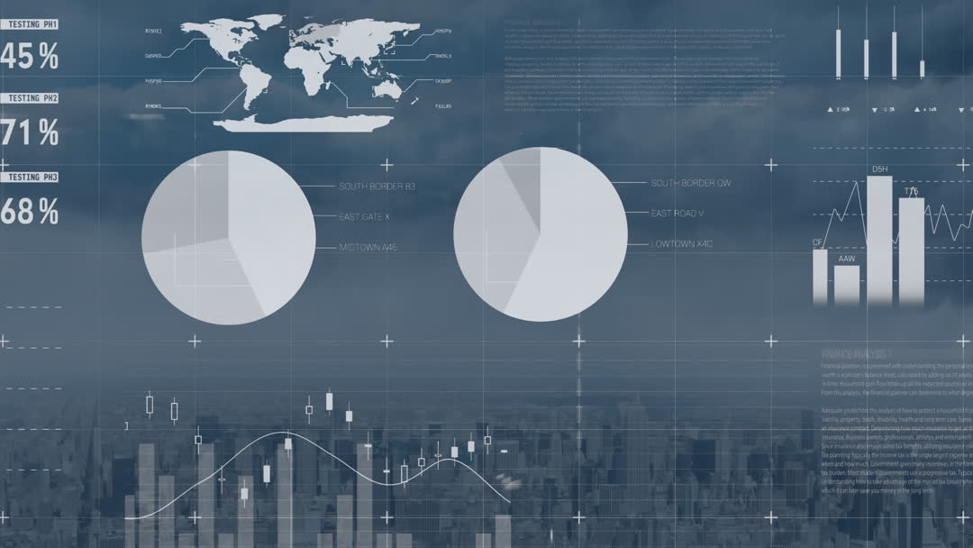 Visual displaying animated statistics and data processing with technological elements, showcasing global business potential. Useful for illustrating data analytics publications, corporate presentations, and technology-related promotional materials.