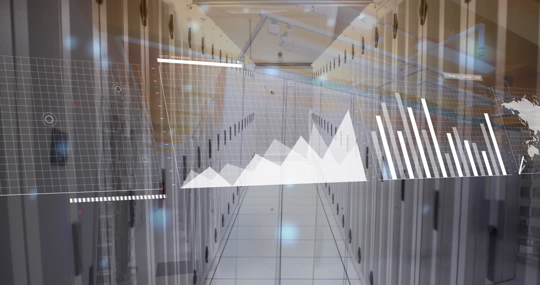 Visualizing financial statistics with data graphs overlaying a server room creates a futuristic feel. Ideal for illustrating concepts related to big data, analytics, technological advances, and global business strategies. This visual theme suits presentations, educational material on data analytics, or marketing materials for tech firms.
