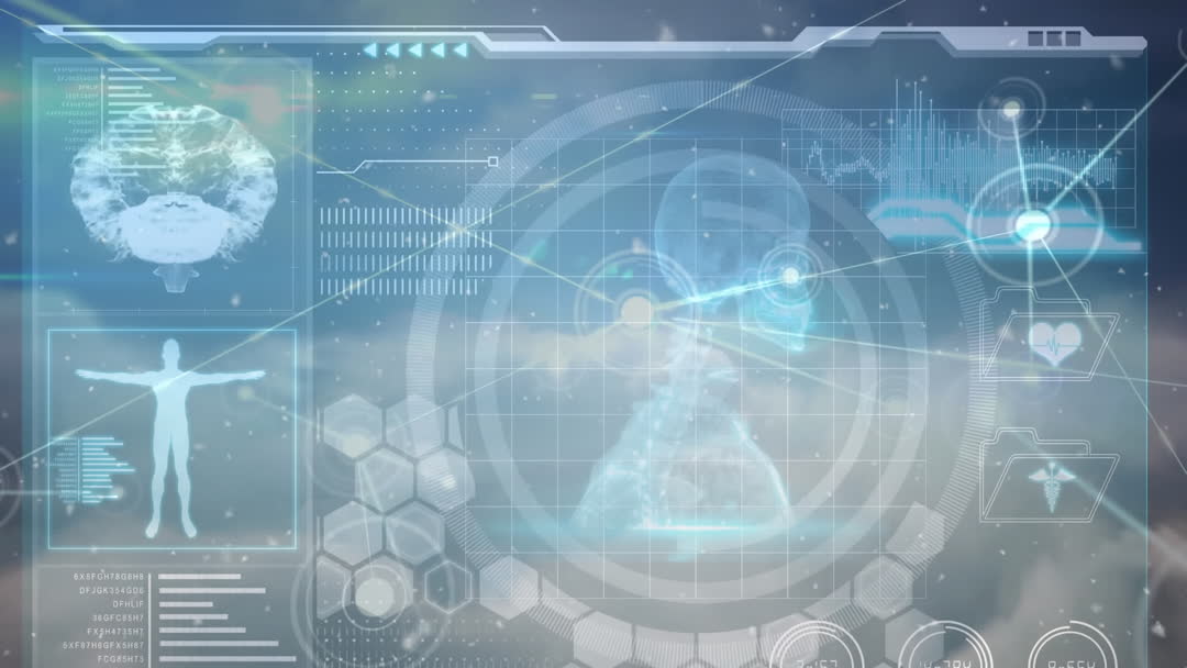 This visual focuses on a digital interface featuring futuristic elements and scientific data visualizations. It includes aspects such as brain scans, heart rate monitoring graphics, and a holistic digital system display. Perfect for educational content, sci-fi projects, tech industry presentations, and content related to data science, analytics, and innovation.