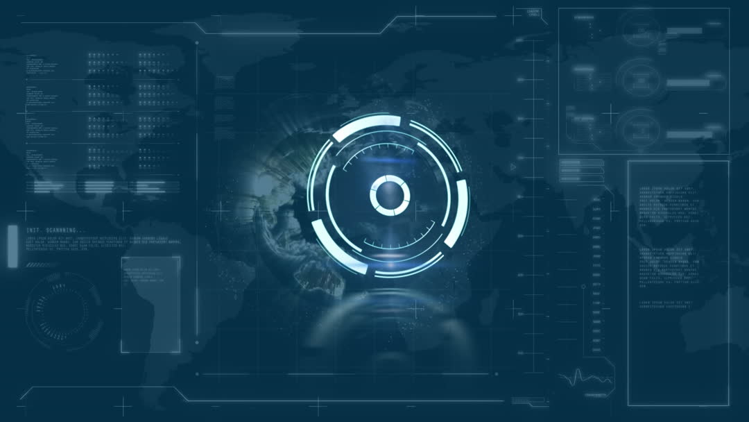 This visual showcases a futuristic digital interface with a focus on global data scanning processes. Icons of data analytics overlay a map, suggesting advanced technology and connectivity in cybersecurity and data-processing sectors. Suitable for illustrating technology concepts, fintech presentations, and digital transformation marketing materials.