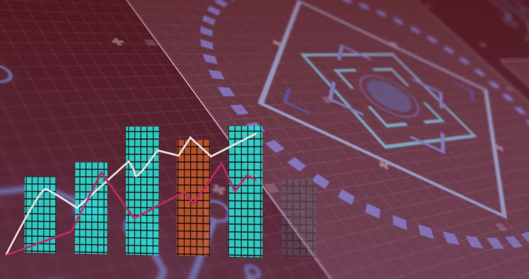 The blend of bar and line graphs overlaid on a digital interface with geometric designs represents modern data analysis tools. Useful for backgrounds in presentations or articles on tech trends, analytics, finance, and business strategy.