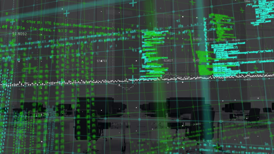 Innovative technological digital interface featuring animated graphs and data processing codes in a futuristic office environment. This visual is ideal for use in presentations, articles, and content related to technology, computer science, software development, and data analysis. Great for illustrating modern digital trends and technical innovation.