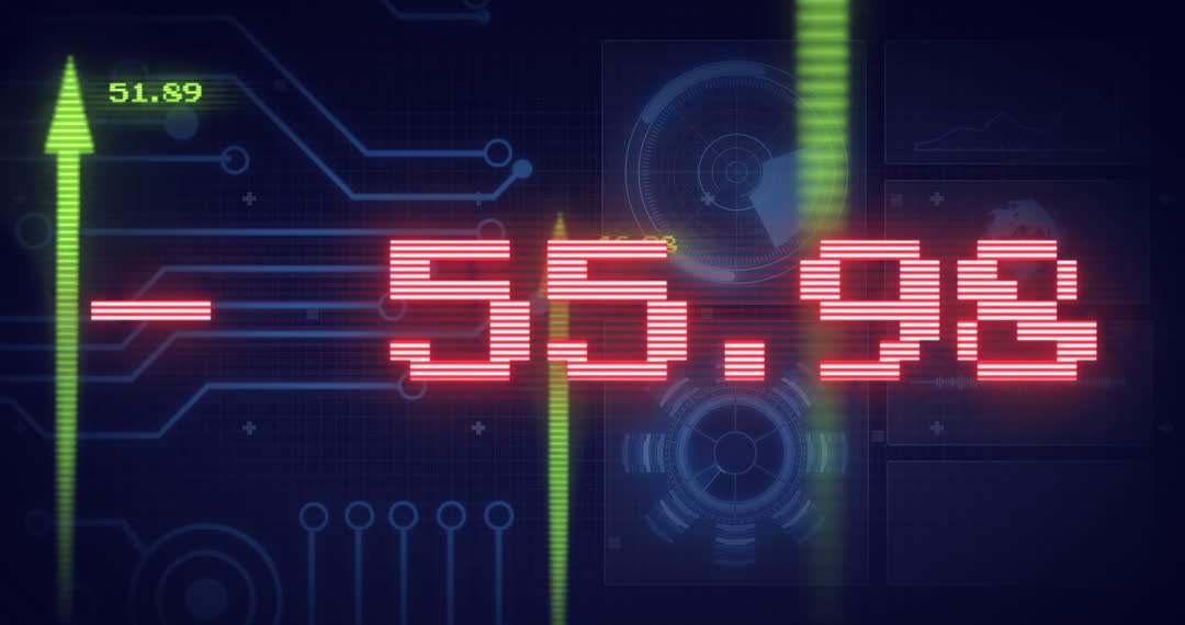 Depicts high-tech elements commonly associated with data analysis and electronic interfaces, featuring circuit board designs and red digital numeric display. Suitable for backgrounds in technology blogs, videos about innovation or electronic components, and presentations focused on data processing and computing advancements.