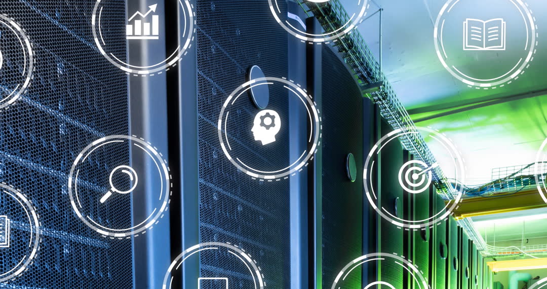 Visual representation of a digital interface superimposed with icons symbolizing various technological components, set against a backdrop resembling data center infrastructure. Useful for illustrating themes around digital transformation, connectivity in tech environments, or the intersection of software with physical hardware in marketing materials, presentations, or articles focused on modern technological solutions and digital innovations.