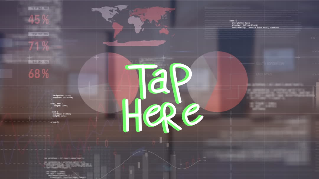 Digital display showcases an animated 'tap here' text with data visualization and processing elements representing a global connectivity theme. Suitable for illustrating concepts of modern technology interfaces, user interaction prompts, and digital innovation strategies in presentations, tech blogs, and promotional videos.