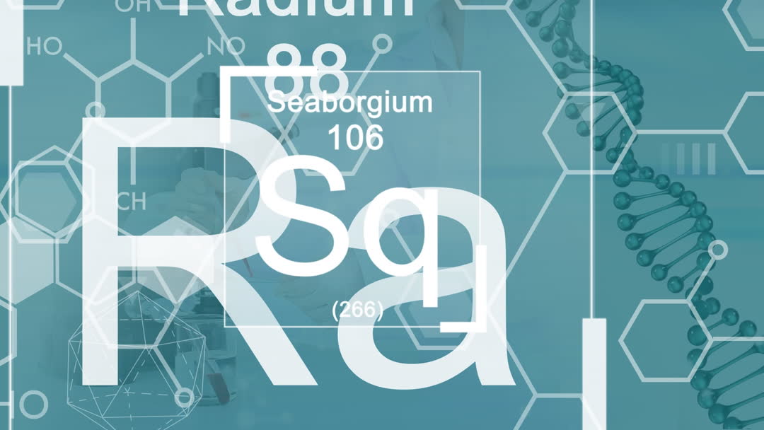 Graphic displays radium and seaborgium elements with DNA and healthcare themes, useful for illustrating concepts in medical research, digital healthcare innovations and chemistry advancements.