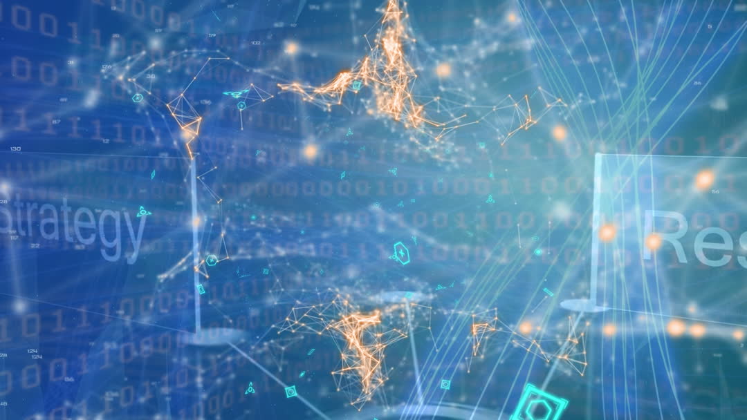 Dynamic animation depicts interconnected digital networks through abstract visualizations, highlighting strategies and data processing. Ideal for use in technology presentations, educational materials on digital transformation, or content related to global communications and information technology concepts.