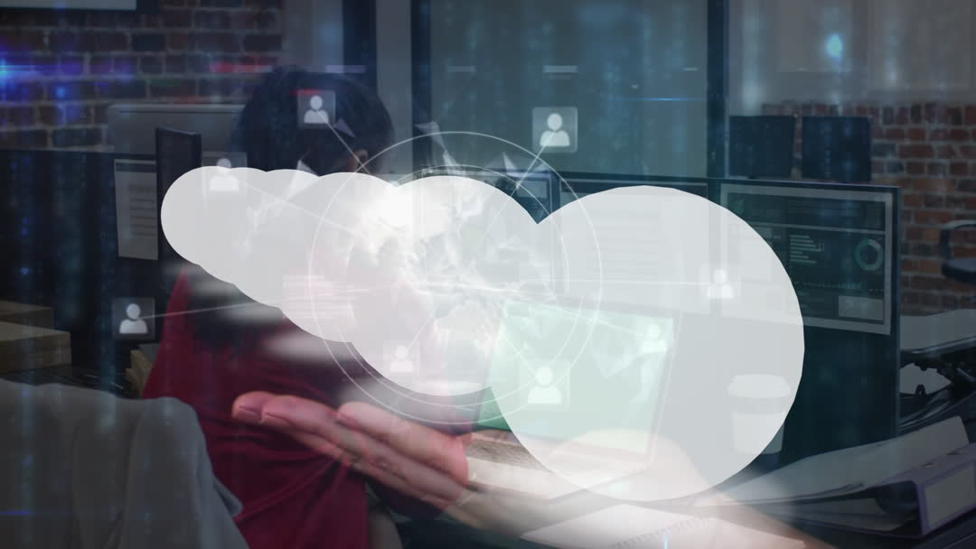 A digital representation displays a biracial female programmer working on a laptop with abstract white technology overlays. This visual is ideal for illustrating concepts related to advanced technology, coding, and digital interaction in professional settings during the COVID-19 pandemic.