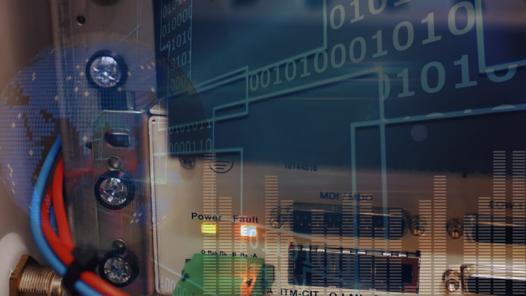 Image features digital interface with binary code overlay on electronic panel highlighting global network connections and data processing elements. Useful for representing technology, innovation in computing, global communication, and cybersecurity themes in presentations, articles, and websites.