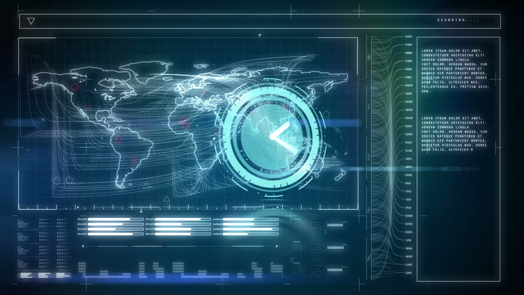 Digital Interface with World Map and Rotating Clock Graphic Video