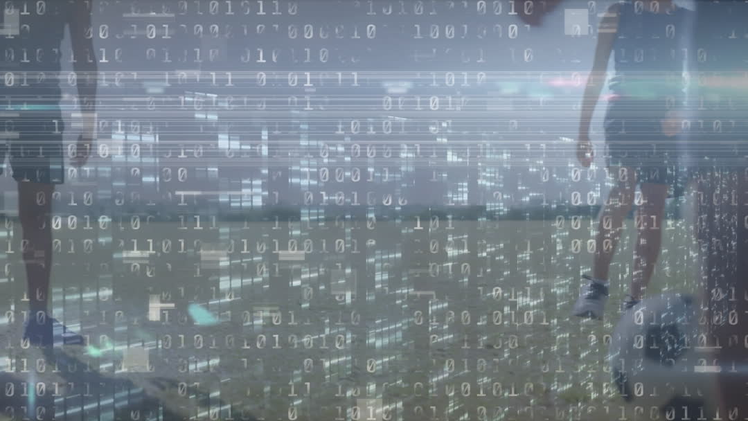 Scene shows digital interference with binary code superimposed over blurred football players on field, conveying a modern sports technology atmosphere. Useful for themes such as sports technology, digital innovations in sports, coding in athletics, or futuristic approaches to sports analytics.