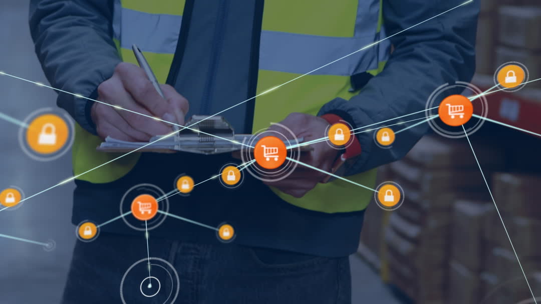 Conceptual video depicting integration of digital interface and network connections in warehouse. Ideal for illustrating supply chain management, digital transformation in business, or advanced logistics solutions. Can be used in articles or presentations on modern inventory techniques and technology usage in logistics.