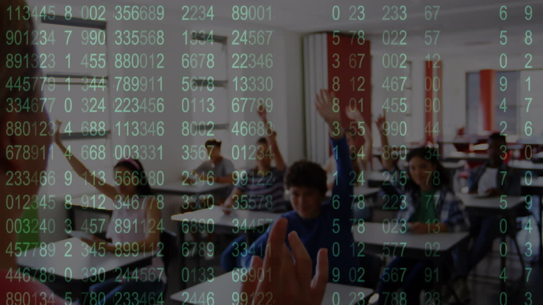 Schoolchildren are depicted raising hands in a classroom environment with an overlay of binary coding. Represents the integration of advanced technology into educational settings. This concept highlights themes of modern education, digital classrooms, and technology in teaching methods. Ideal for use in educational materials, tech blogs, or articles discussing the future of education and the influence of coding in schools.