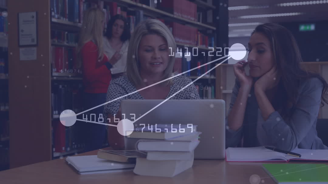 Two women engaging with technology in a library environment, surrounded by books and indicators of connectivity. The scene represents the intersection of traditional education and digital advancement, emphasizing collaborative learning through technological network connections. Useful for illustrating modern educational contexts, technology integration in learning, or the impact of digital tools on study habits.