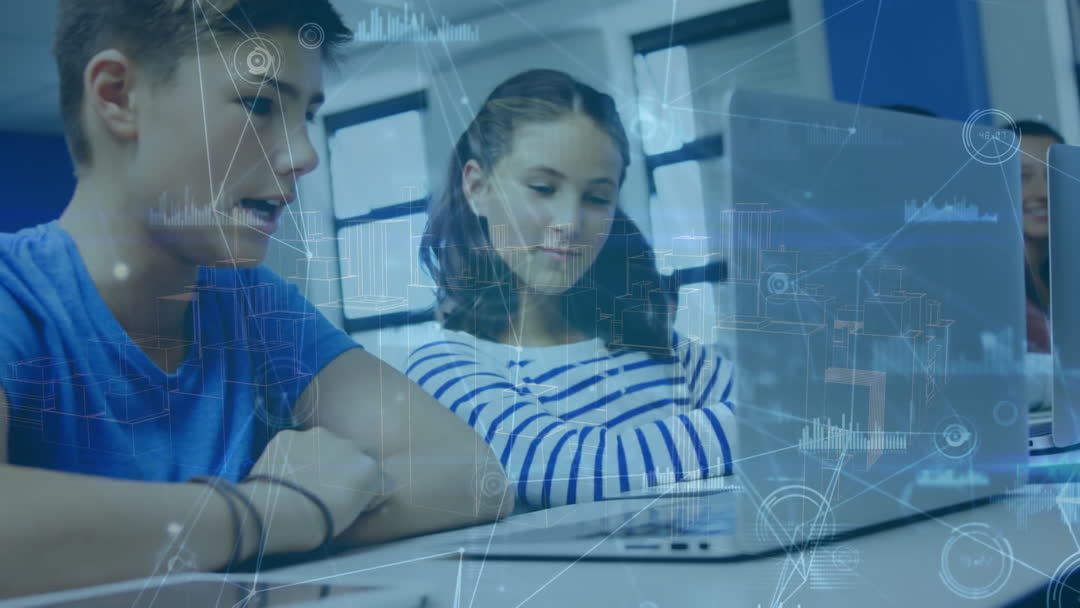 Students engaged in digital learning shown with an overlay of network connectivity graphics, suggesting the blend of technology and education. Perfect for topics on modern educational methods, technology integration in education, or collaborative learning environments. Useful for educational blogs, tech-focused classroom settings, and student engagement resources.