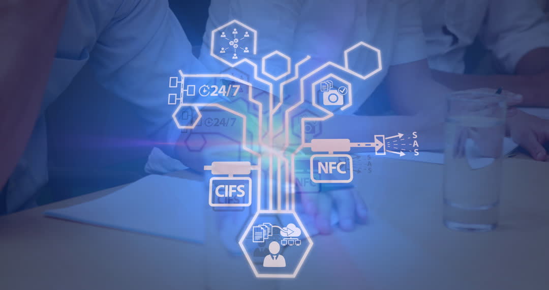 This dynamic illustration highlights students collaborating with digital learning tools incorporating network technology elements like NFC and CIFS. Ideal for portraying modern educational environments, articles on educational tech advancements, or publications focused on tech integration in classrooms.