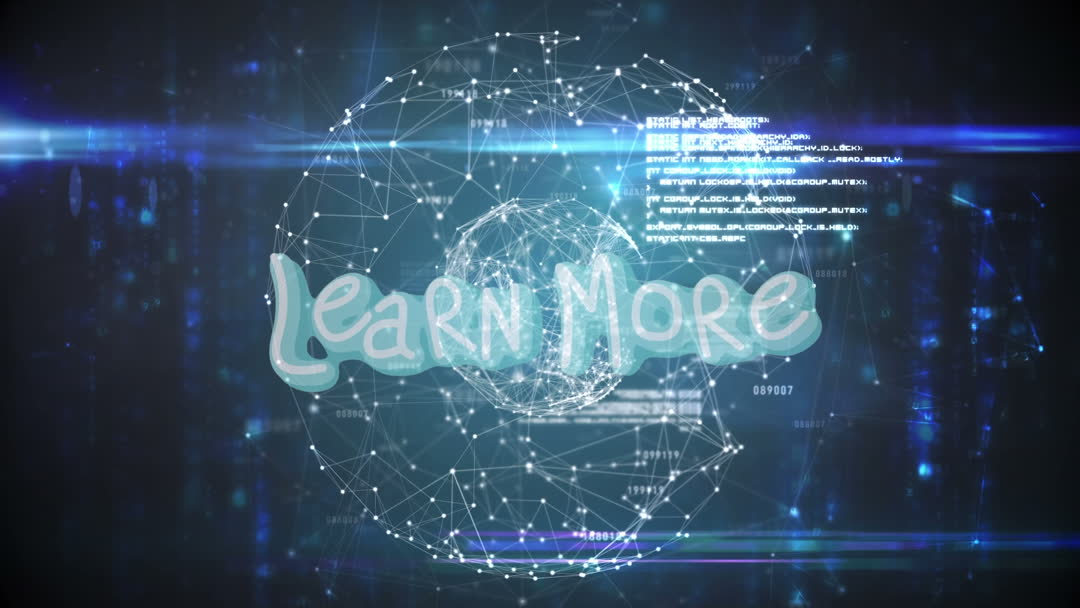The visual features interconnected data nodes forming a digital globe with the prominent text 'Learn More'. This illustration represents the fusion of technology and education. Useful for educational platforms, technological advancement campaigns, and virtual learning promotions to depict a futuristic and connected learning environment.