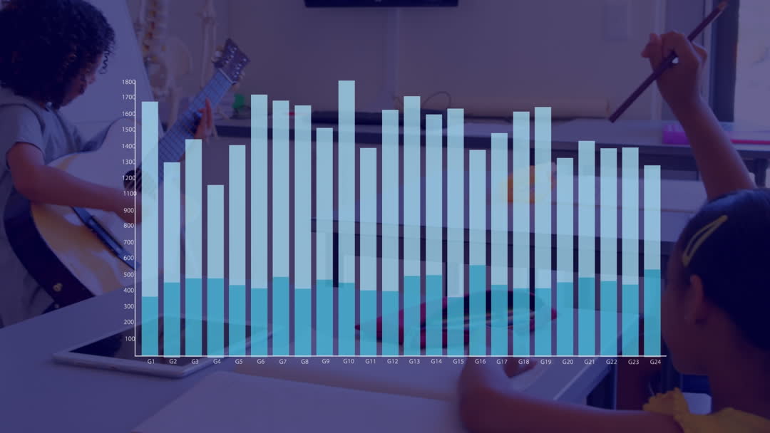 Overlay of charts and graphs on classroom environment shows merging of traditional education with technological advances. Useful for illustrating concepts of educational trends, student engagement with technology, and digital integration in learning spaces.