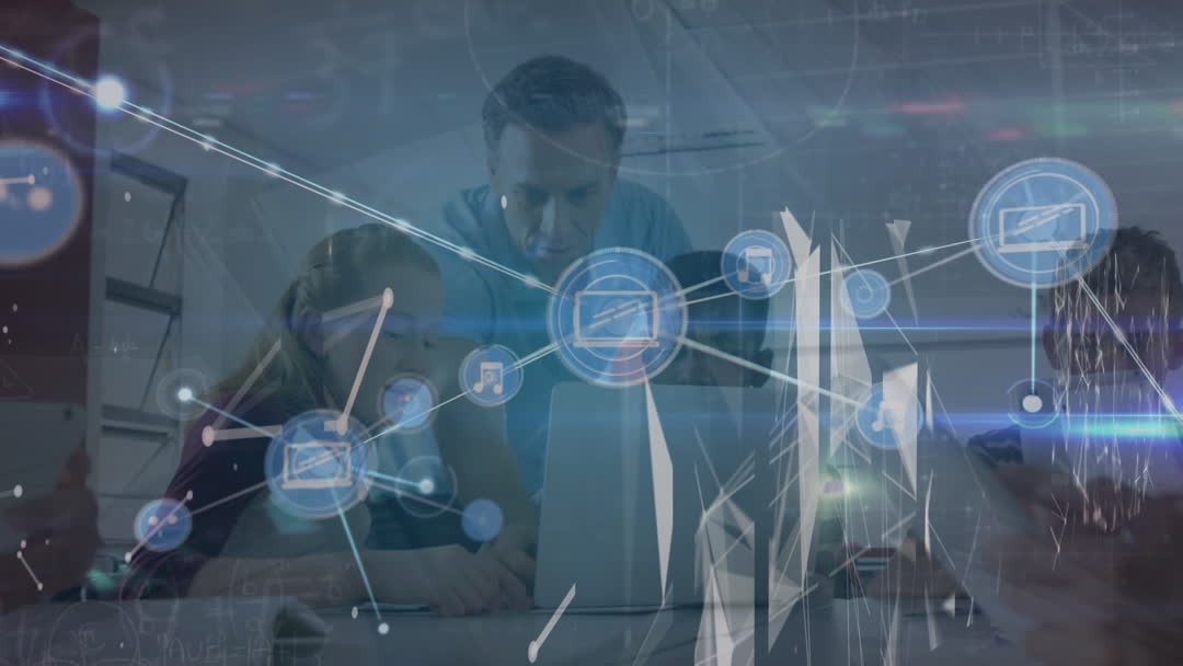 The video portrays a teacher helping students in a classroom with digital connections overlay. This suggests an integration of technology in education, illustrating the concepts of modern tech-driven learning and collaboration. Useful for depicting educational technology, online resources in schools, or tech advancement in classroom settings.