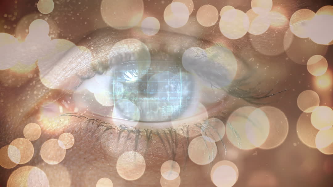 Eye magnification blends with colorful bokeh lights creating a futuristic holiday vision ambiance. This visual metaphor shows technology infusion with festive joy, suitable for themes around innovation, future holidays, and digital photography advancements.