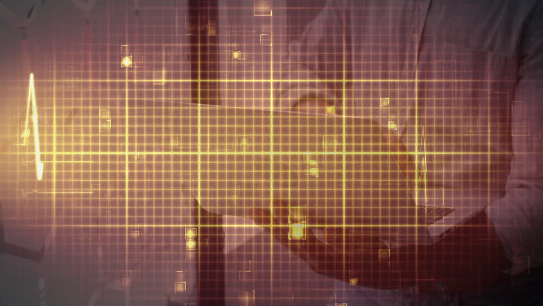 This conceptual video features a digital lifeline animation overlaying a businessman using a laptop, representing the intersection of technology, global health, and business. The glowing grid and data visualizations express innovation and modern digital solutions. Suitable for illustrating content related to digital health technologies, business strategies, or tech industry trends. Ideal for use in presentations, reports, or articles exploring advancements in business interfaces and global connectivity.