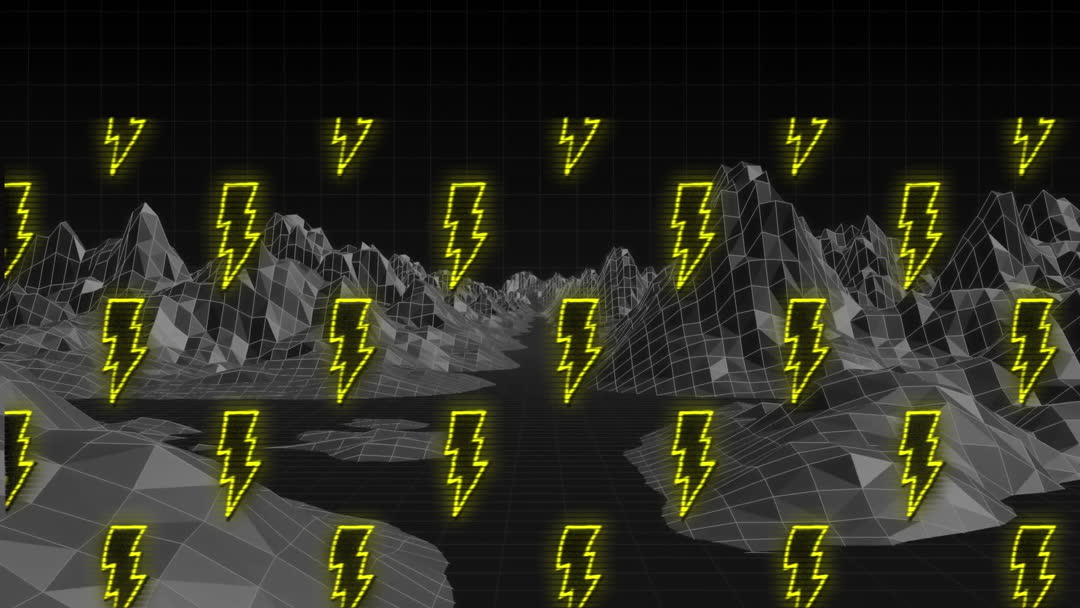 Digital representation of neon yellow lightning icons floating over a grid-like mountainous terrain, creating a futuristic cyberpunk atmosphere. Ideal for illustrating concepts related to digital landscapes, social media interfaces, and technology advancements. It can be used in creative media productions, technological websites, or for discussions about virtual reality and metaverse developments.