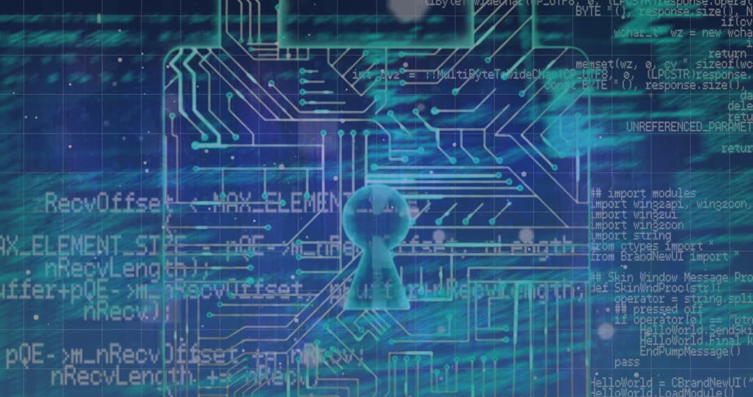 Visual focuses on technology and cyber security themes, depicting a digital lock superimposed on circuit board and coding elements, suggesting data protection. Useful in illustrating concepts like internet security, digital defenses, and information technology innovations, suitable for tech website backgrounds, cyber tech promotions, and digital security content.