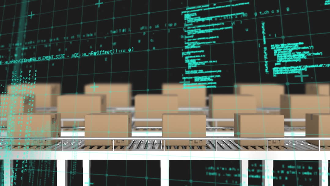 - Digital Logistics Concept: Packages Moving on Conveyor with Data Overlay