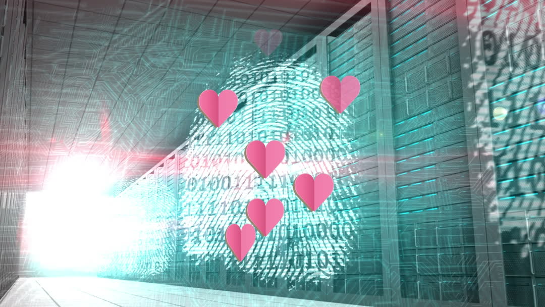 This video depicts elements of technology with heart symbols flowing through a digital data stream. It symbolizes the intersection of love and technology, suggesting data narratives, modern communication, or online security. Ideal for illustrating topics related to digital interactions, encrypted communications, or financial technology innovations. Great for websites, presentations, or articles about digital romance and cyber security.