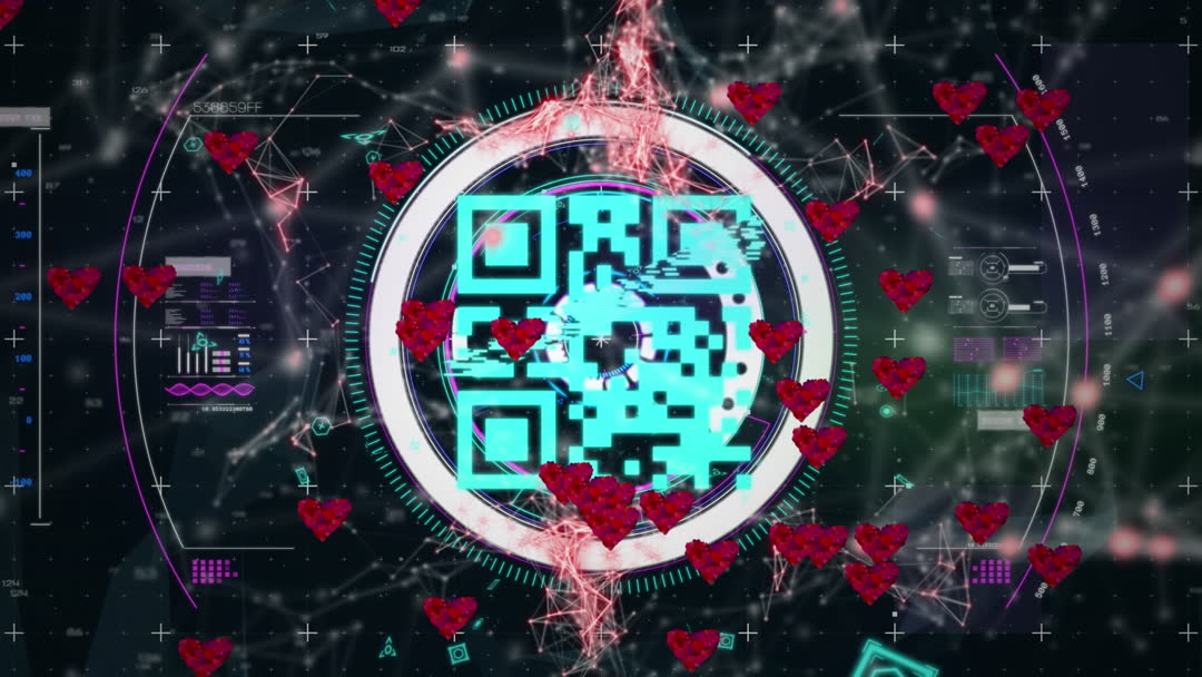 Futuristic animation depicts hearts floating around an intricately detailed QR Code within a digital data interface. This video captures the intersection of romance and technology, depicting new technological settings like instant internet connectivity or digital encryption of messages of love. Perfect for use in promotions related to dating apps, digital Valentine's Day marketing, or illustrating the integration of emotional technology within modern digital communications.
