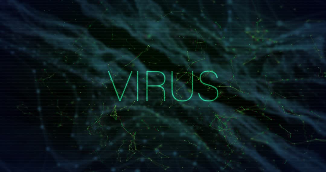 Text indicating 'virus' is prominently displayed with an intricate digital network overlay in the background, conveying themes of cybersecurity, data processing, and technology risks. Could be utilized in tech blogs, presentations about Internet of Things (IoT), or cyber threat discussions to illustrate caution and risk in digital environments.