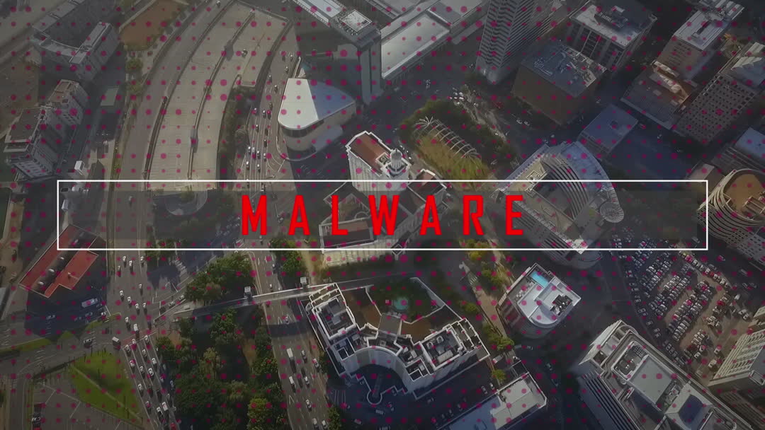 Digital Malware Overlaid on Cityscape Background Video