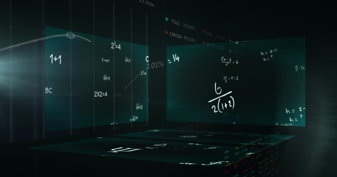 This futuristic scene illustrates floating holographic mathematical equations alongside financial data and graphs. Perfect for showcasing concepts related to financial analysis, investment, and stock market dealings. Ideal for use in presentations on technology-driven financial services, virtual calculations, or abstract themes in finance education and workshops.