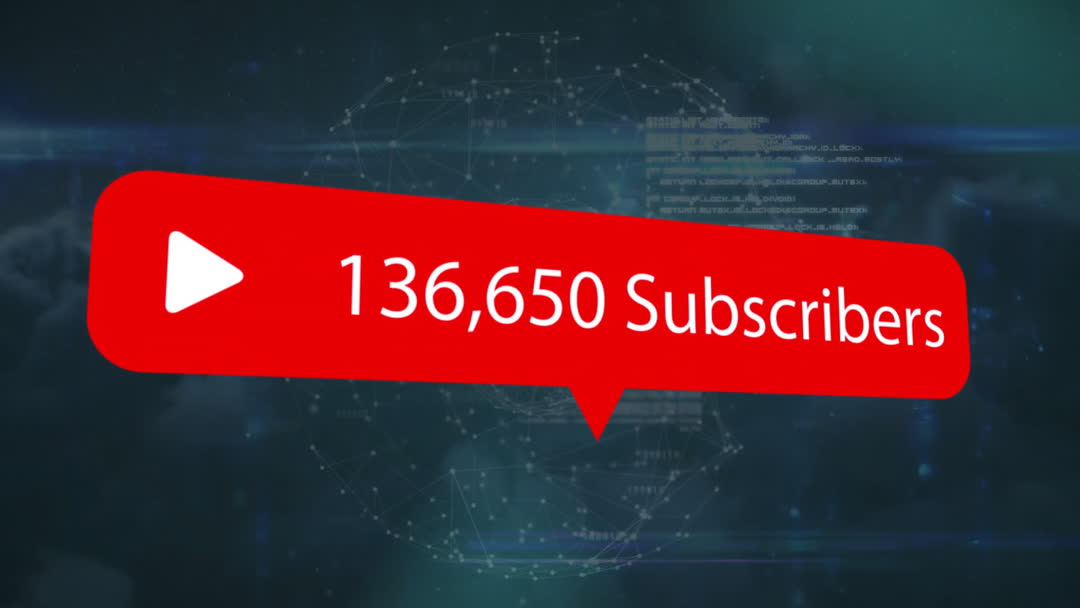 Animated icon featuring a play symbol and subscriber count over digital data visualization. Ideal for content creators, social media marketers, showcasing internet growth metrics, or digital interface design concepts.