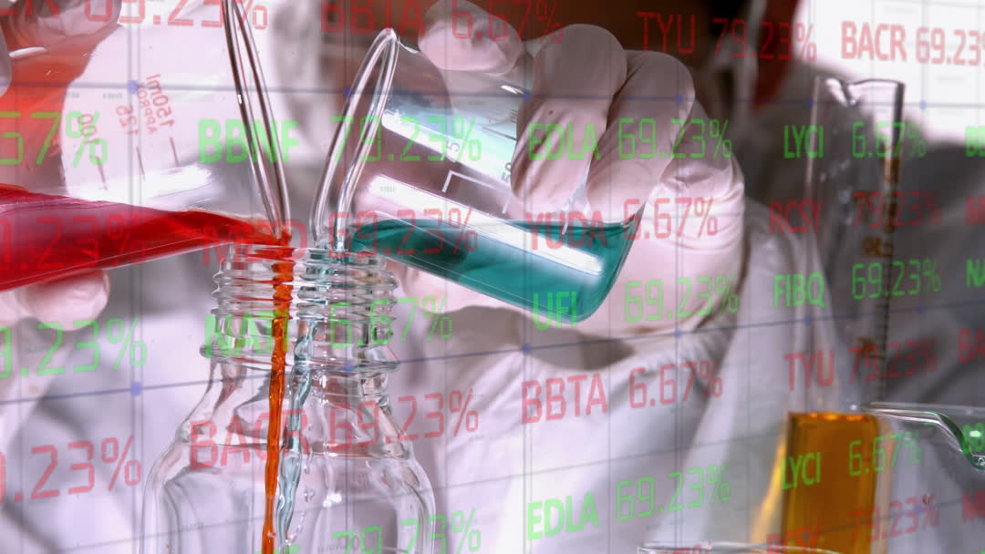 Reflects merging of scientific research with financial technology by showing a scientist with beakers and financial data projections overlayed. Useful for illustrating modern technology integration in financial industries, research impact on financial markets, or tech innovations in science.