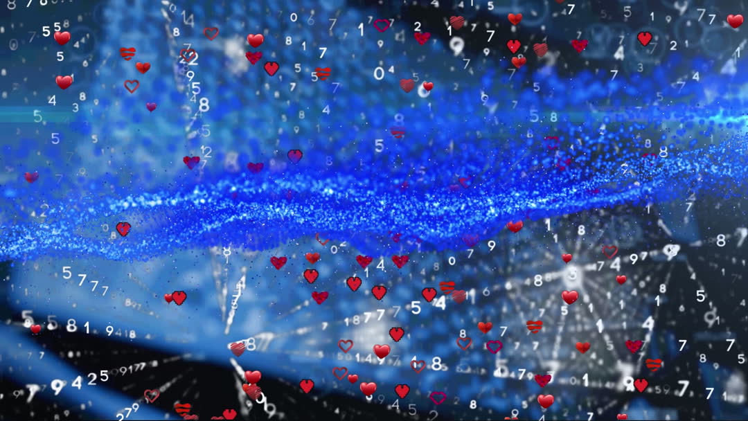 A futuristic digital mesh with streams of numerical data and small hearts weaving through. This conveys the concept of connectedness and modern data processing. Ideal for technology presentations, research highlights, presentations on digital globalization, or in illustrating networks and advanced computing thought streams.