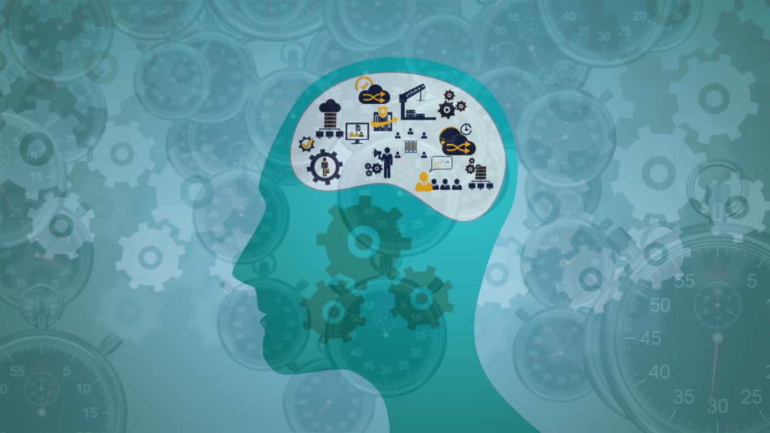 Concept combines human thought with mechanical innovation and time management, signifying ideas interfacing with technology. Useful for presentations about innovation, psychology, or technological advancements.