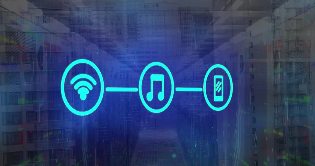 The video shows blue icons of network, music, and mobile phone interconnected, overlaying a backdrop of digital units and city buildings. This represents the concept of connectivity and the integration of entertainment and communication technology in modern urban settings. Useful for illustrating technology conferences, communications projects, and digital lifestyle marketing.