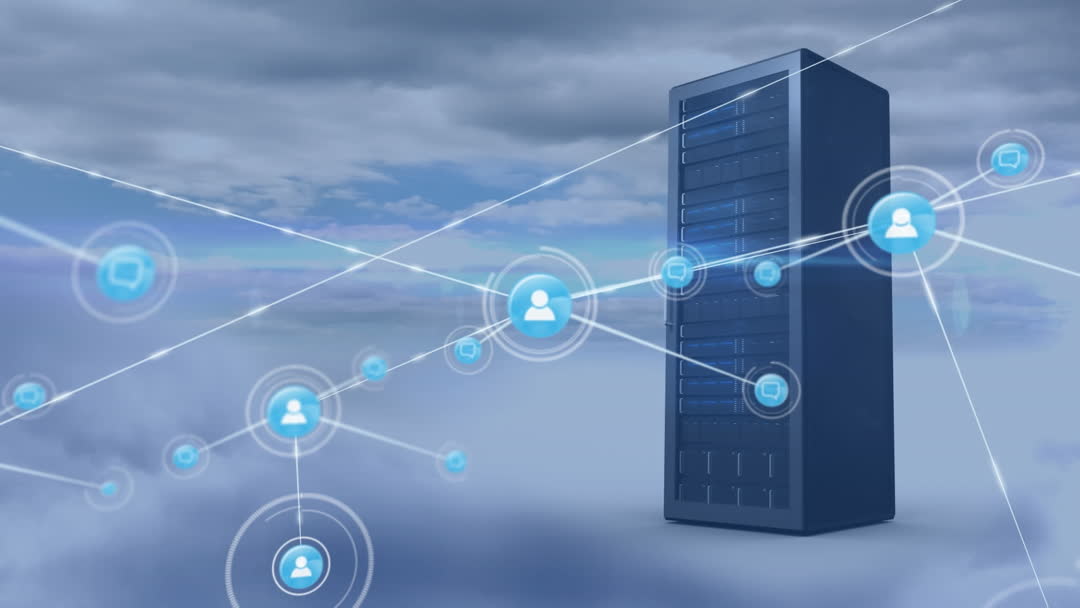 Illustration shows virtual connections and icons linked to a server tower amid clouds. Suitable for technology blogs, cloud computing services branding, and presentations on data accessibility and cybersecurity solutions.