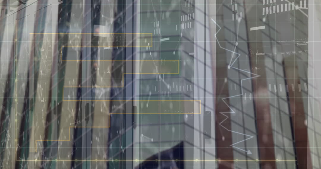Conceptual video showing animated graphs overlaid on a modern office building. Illustrates idea of digital connectivity and communication between servers, emphasizing data flow and technological advancements. Useful for technology presentations, corporate materials, or visual essays on digital transformation.