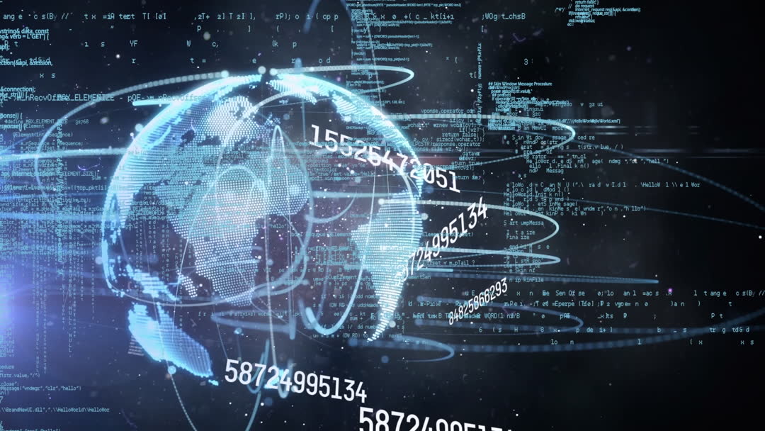 Abstract visualization features globe surrounded by data and numbers, illustrating digital network and information processing technology. Ideal for articles on digital transformation, network security themes, technology future predictions, and presentations showcasing connected systems and big data insights.