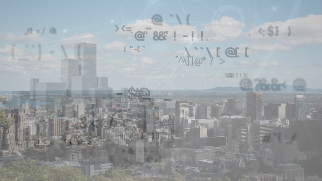 Visualizing abstract digital connectivity and technology symbols overlaying a metropolitan cityscape, this video represents the fusion of technology and urban environments. Suitable for illustrating concepts related to smart cities, digital transformation, internet internet connections, and innovative technology solutions in a business or urban planning context.