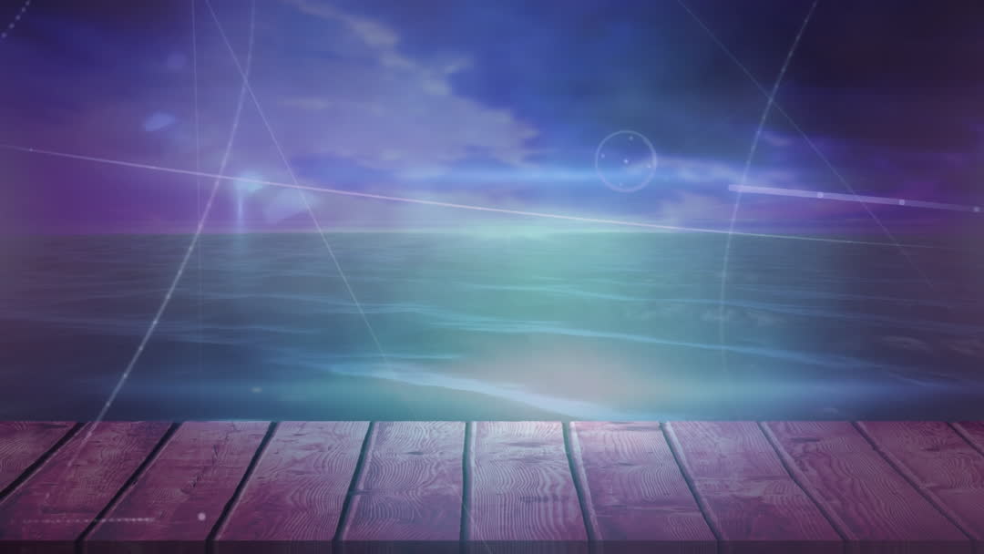 A digital representation of interconnected networks appears over a scenic wooden bridge with an ocean backdrop. Perfect for illustrating themes of connectivity and futuristic technology. It can be used in presentations about global communication, data networks, or technological advancements.
