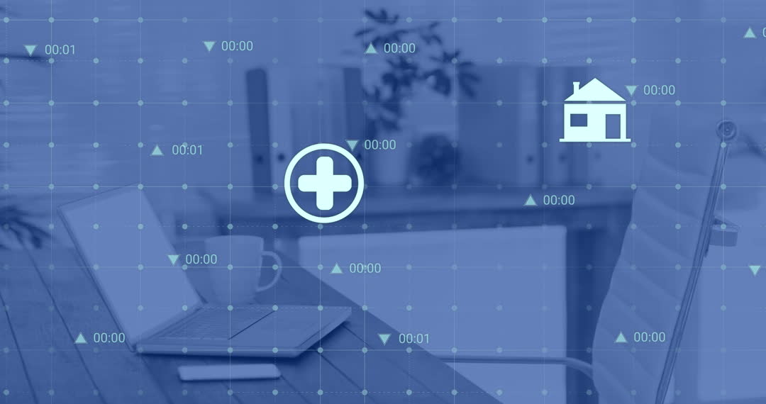 Animation features digital icons projected over a grid network placed over an office desktop setting, showcasing a balance between healthcare and home applications in a business environment. Useful for illustrating tech trends, digital workspace concepts, and modern work relationships in business articles or presentations related to technological advancement.